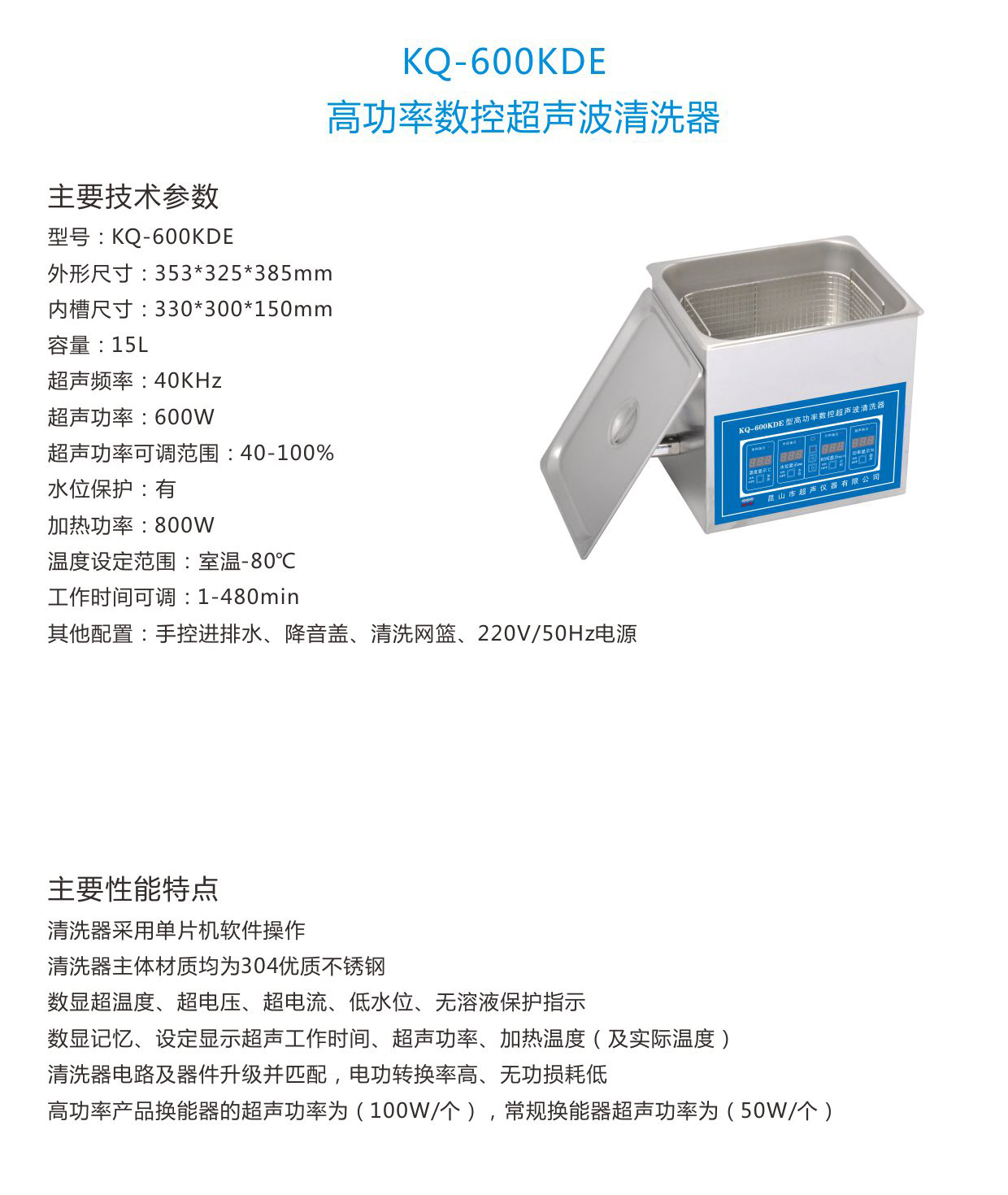| 超声功率可调范围:40-100% | 水位保护:有 | 加热功率:800W | |